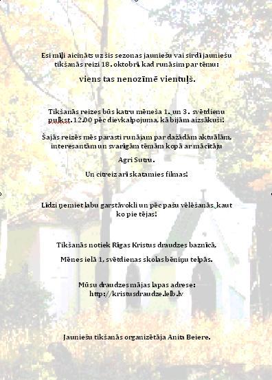 Esi mīļi aicināts uz šis sezonas jauniešu vai sirdī jauniešu tikšanās reizi 18.oktobrī 12.00 pēc dievkalpojuma, kad runāsim par tēmu: VIENS - TAS NENOZĪMĒ VIENTUĻŠ!